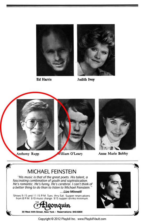 He was meeting a lot of actors during that period, enjoying the time-honored custom of late-night, post-show gatherings at which many different Broadway casts would eat and mingle. Rapp had relocated from Joliet, Illinois, with his mother Mary for the run of the play; he’d even taken the semester off from school. Sometimes his mother would accompany him to those events, but sometimes she’d let him go alone.