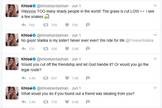 Khloe took to Twitter over the weekend shedding some light on the incident and asking followers, “What would you do if you found out a friend was stealing from you?”