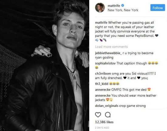 Rife’s own Instagram photo cropped out Beckinsale, but clearly showed him in full Sid Vicious costume, down to the leather jacket, lock and chain necklace, and chest carving/writing (Sid Vicious once famously carved “Gimme a fix” on his chest before a performance).