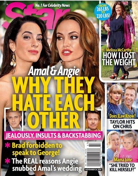 Even the guys’ beautiful brides – Angelina Jolie and Amal Clooney – reportedly hate each other now. Said the source: “Angie thinks Amal is ‘putting on airs,’ and Amal thinks Angie is a pretender.”
